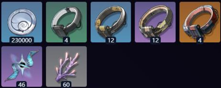 贝币23W、简陋镣环4、基准镣环12、改造镣环12、特制镣环4、奇点拓扑46、紫珊瑚60