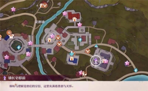 传送至花愿镇的【镇长宅邸前】传送点,沿着小路前往任务追踪位置,任务的位置如图所示,靠近托卡尼所在的位置。
