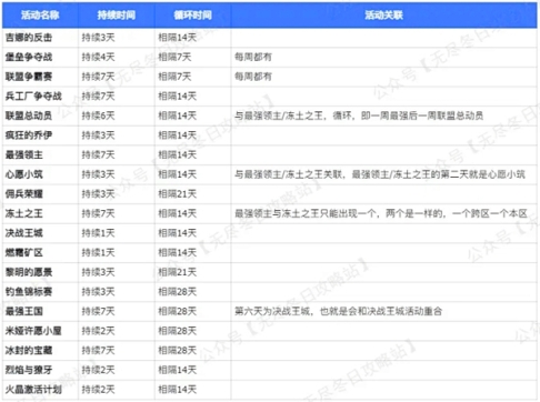 无尽冬日的活动安排是周期性进行的,包括每周赛事、双周活动、三周一次的盛事以及月度大赛等。下面小编将详细介绍每个周期的活动安排。