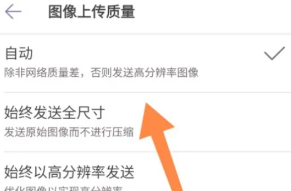 图片上传质量通常分为几种状态,包括“自动”(根据网络状况自动调整质量)、“低分辨率”、“中等分辨率”和“高分辨率”。默认为“自动”状态,即根据当前的网络连接速度和质量来自动选择上传的图片质量。如果你希望上传的图片始终具有高质量,可以选择“始终以高分辨率上传”选项。
