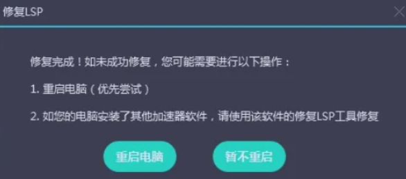 在点击修复LSP后,根据UU加速器的提示,您可能需要重启电脑以使修复生效。这一步不是必须的,取决于修复操作的性质和UU加速器的具体实现。